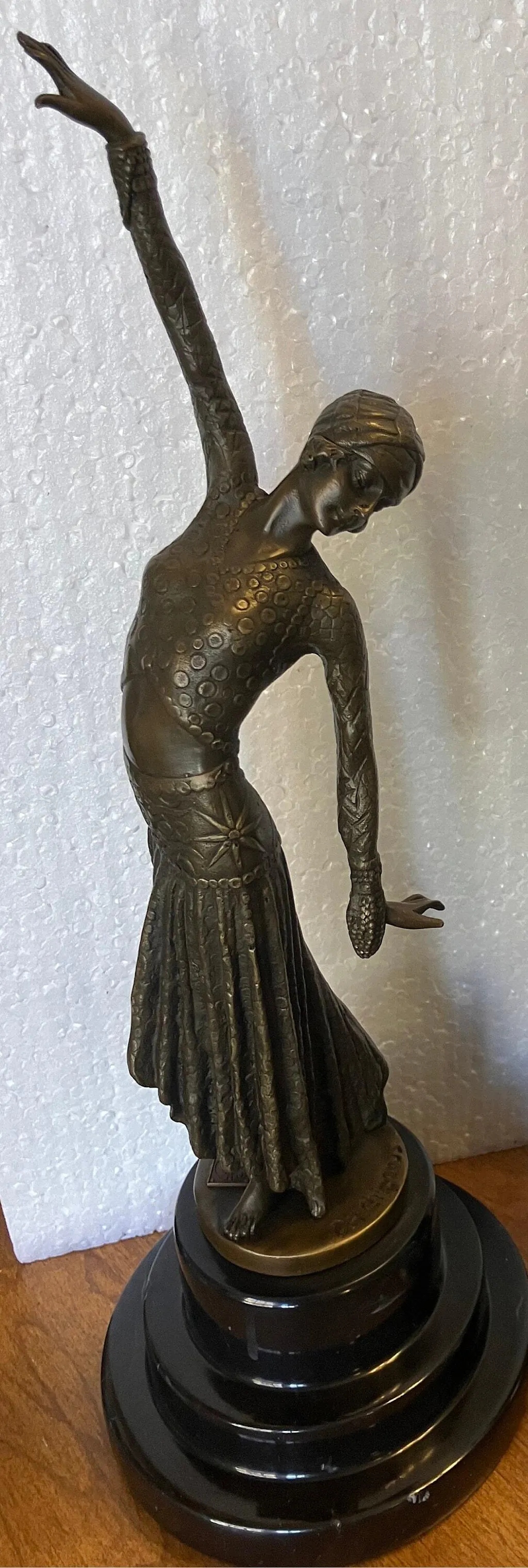The sculpture is made in the Art Deco style as can be seen in the fine details in the outfit of the female. It is made after the great work by the famous Romanian sculptor Demetre Haralamb Chiparus (1886-1947). Chiparus was known for his exceptional dancer sculptures.