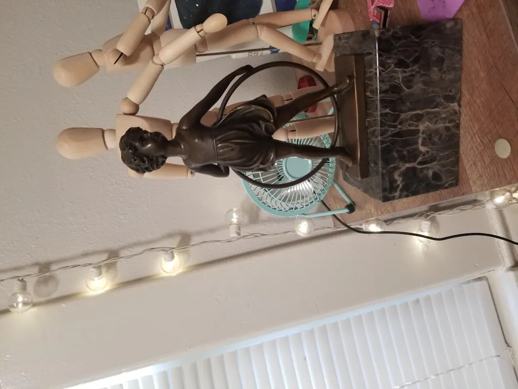A lovely bronze sculpture depicting a young girl standing with a hoop behind her back.