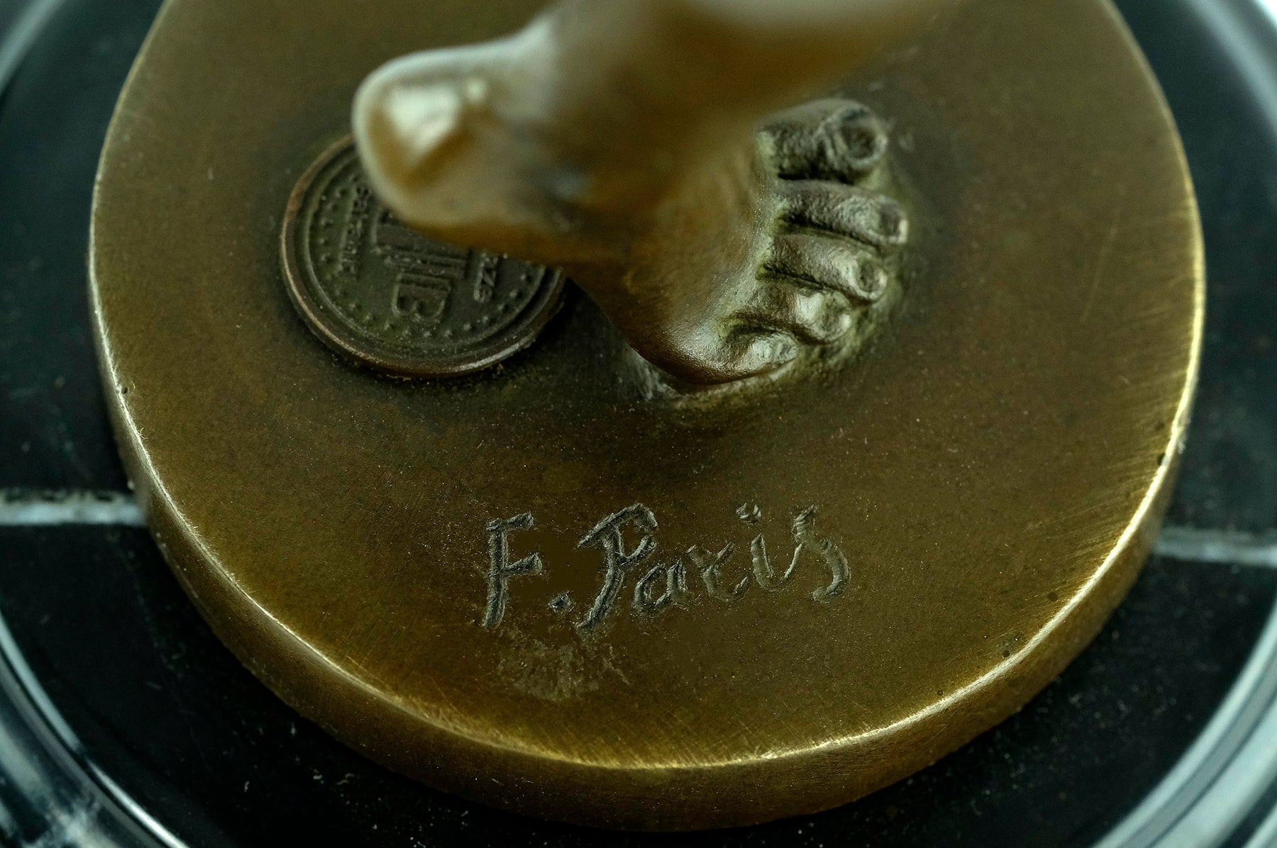 It is made of a great quality bronze and mounted on a round dark marble base.