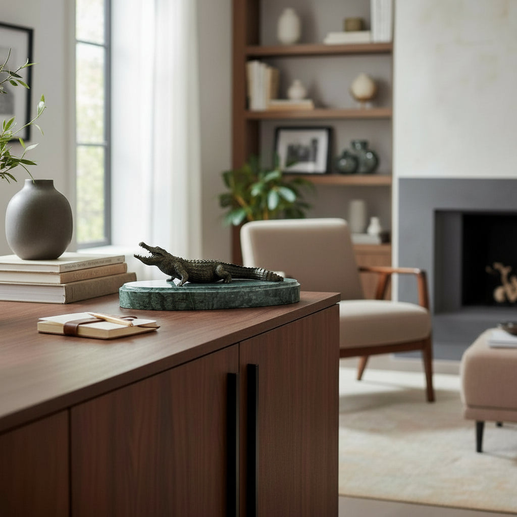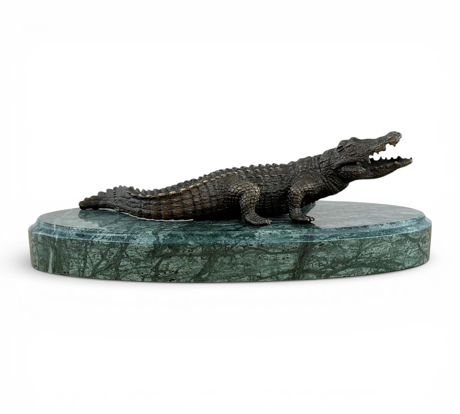 A finely detailed bronze sculpture of a crocodile, captured in a lifelike pose with its jaw open.