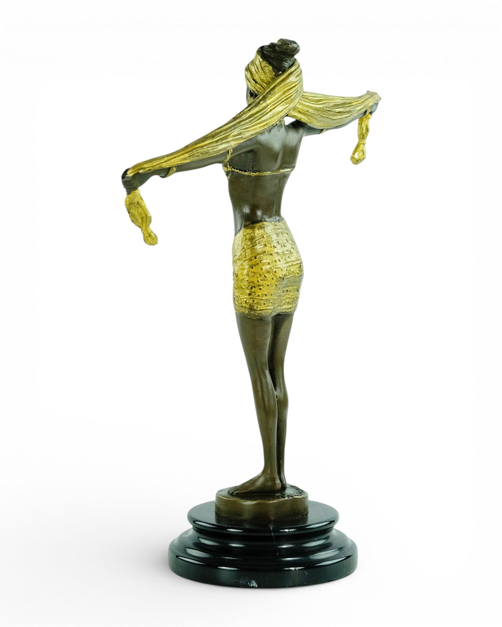 It is made in the Art Deco style and cast in high-quality bronze, mounted on a round marble base. Finished with a warm brown patina, it also features gold-coloured accents on her scarf, outfit, and jewellery, making it a true eye-catcher.