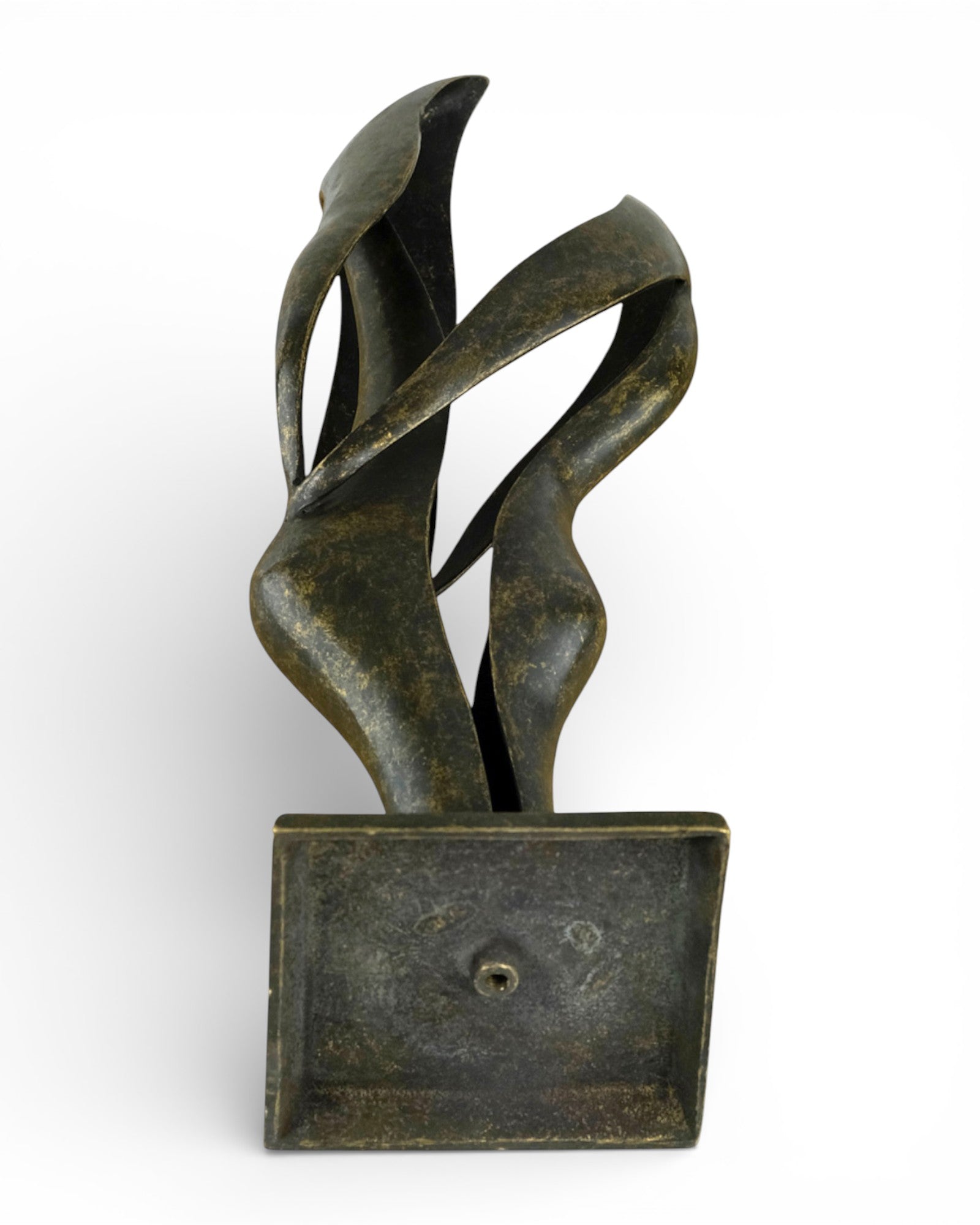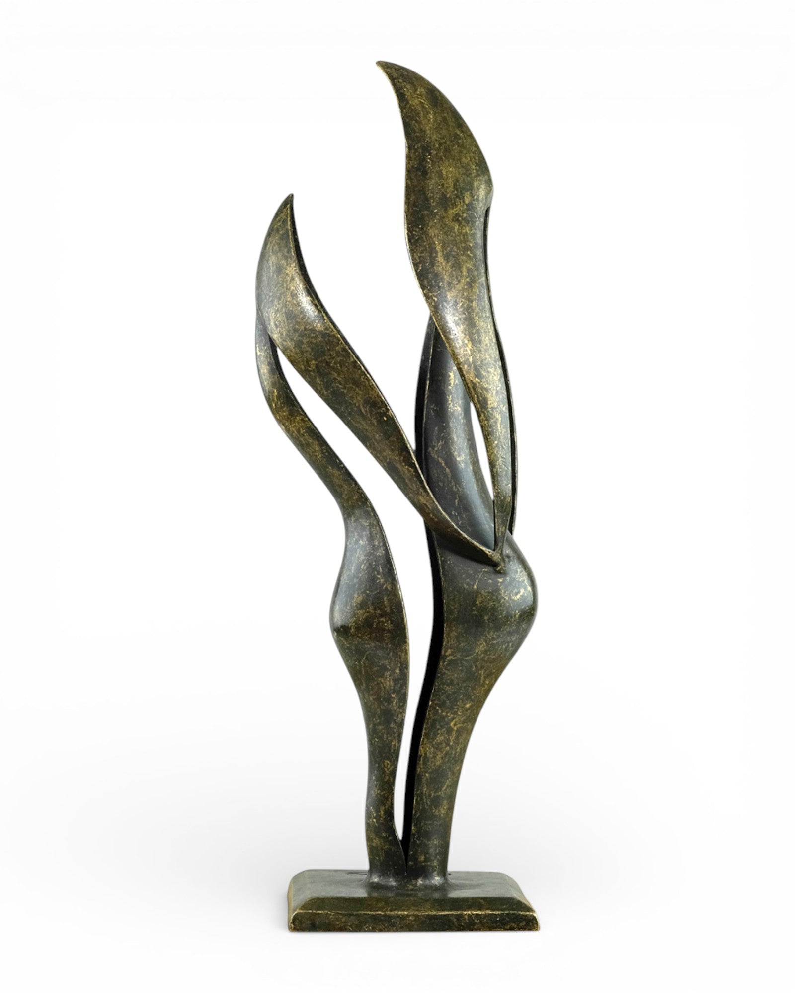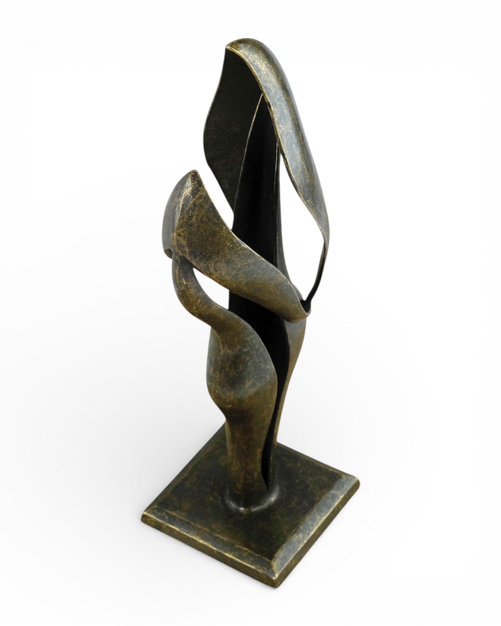 A modern bronze sculpture depicting an abstract couple united in harmony.