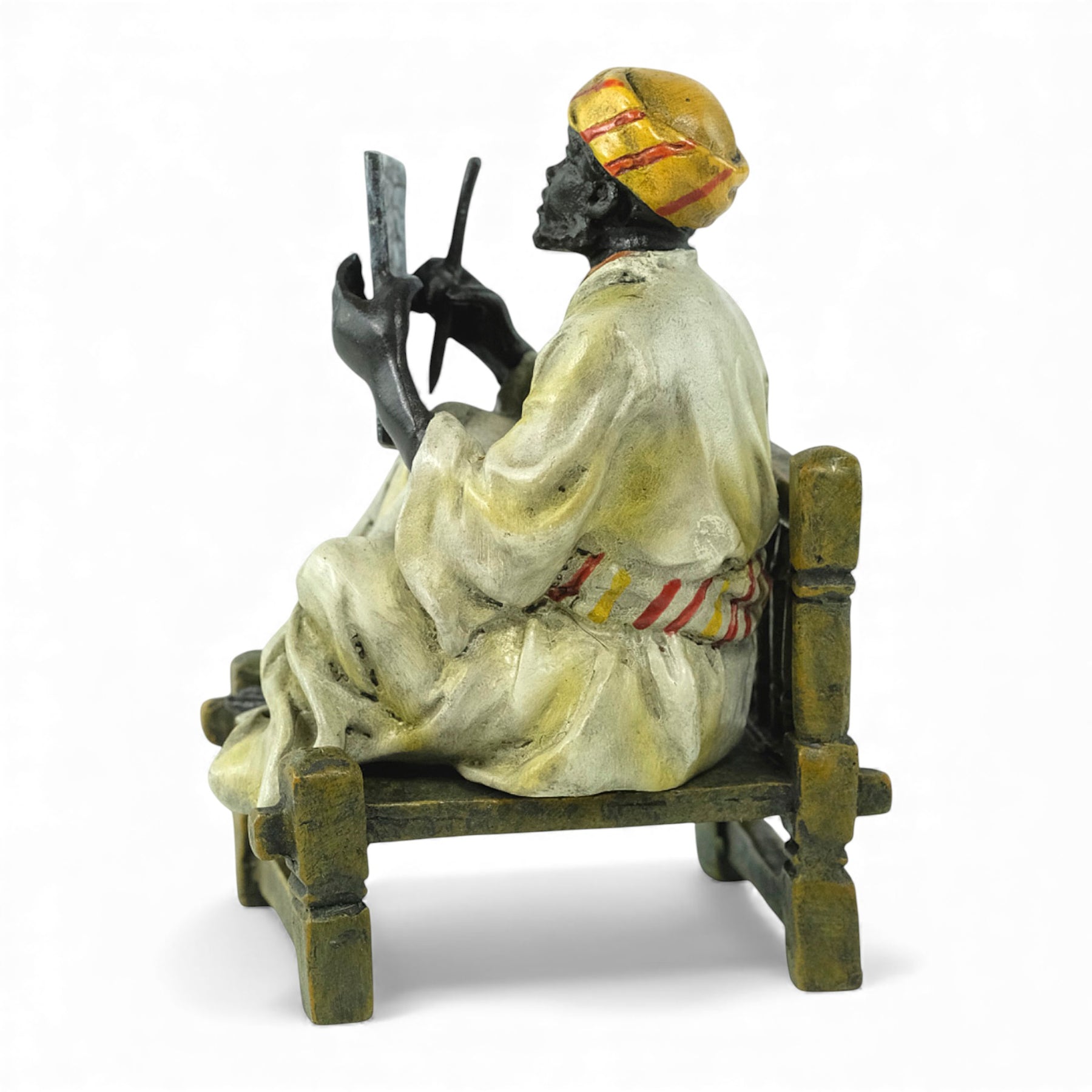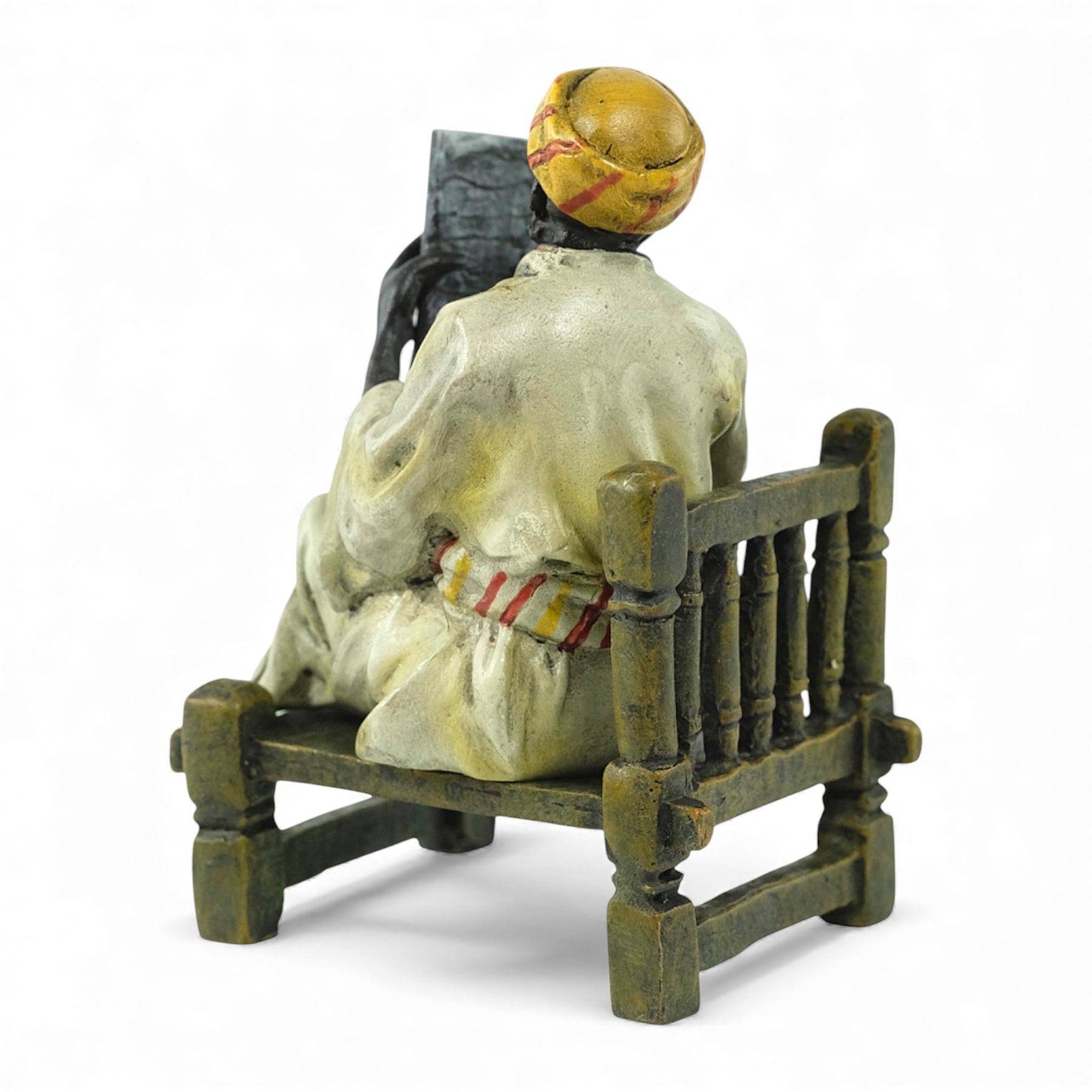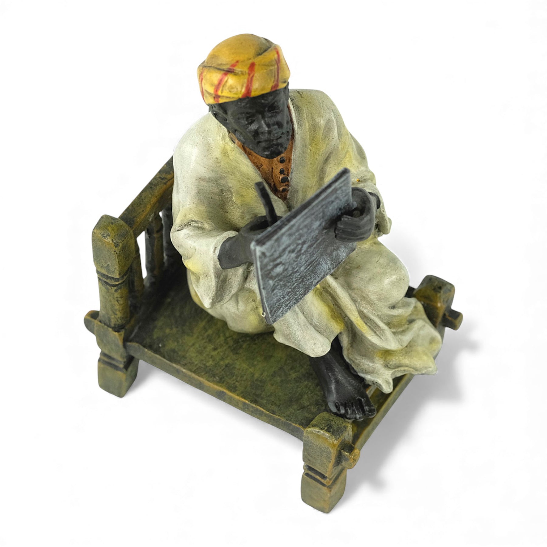 This finely detailed piece is crafted in the Vienna bronze style, made from high-quality bronze and cold-painted in soft pastel colors. It consists of two separate parts (the poet and the chair), creating a dynamic and engaging composition.