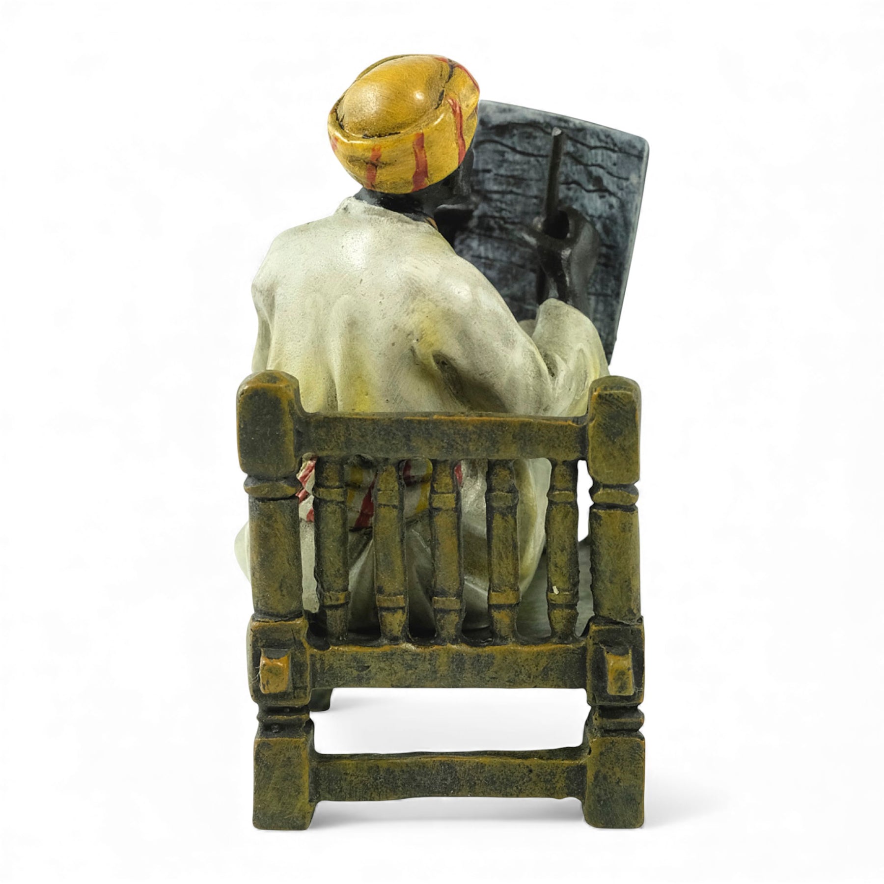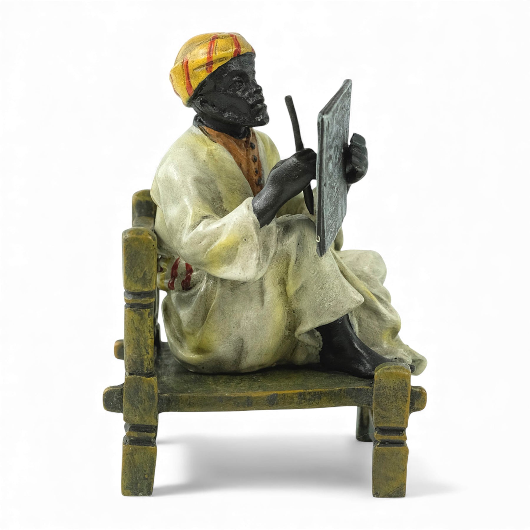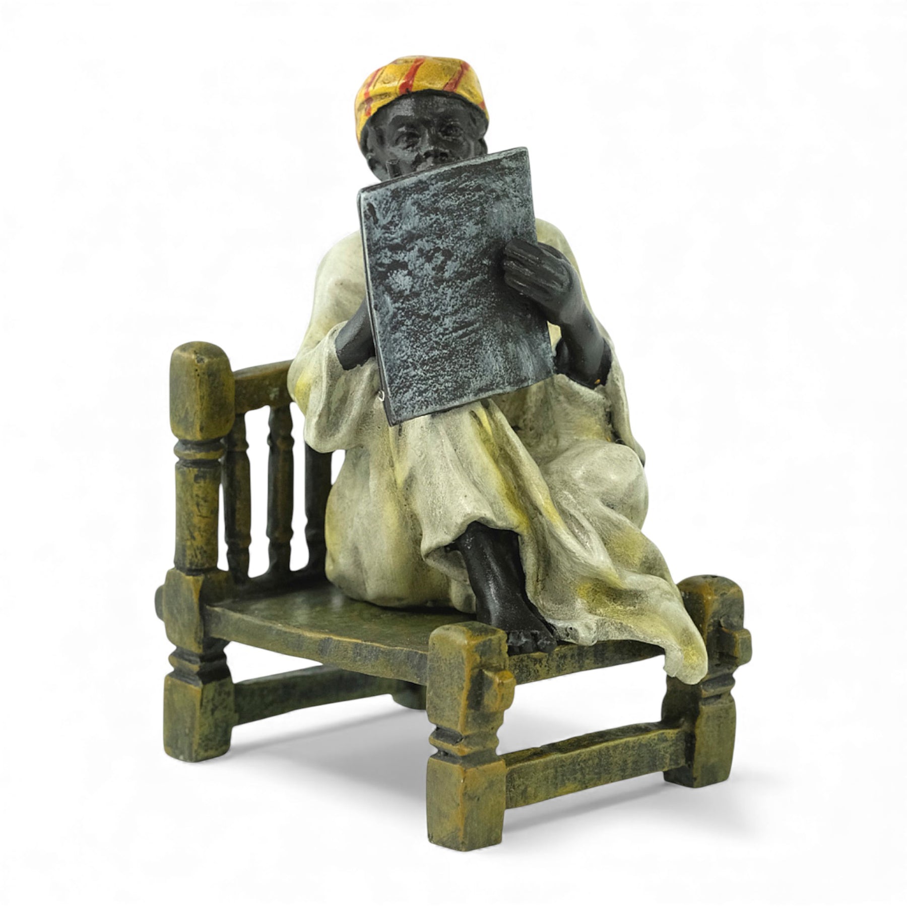 This finely detailed piece is crafted in the Vienna bronze style, made from high-quality bronze and cold-painted in soft pastel colors. It consists of two separate parts (the poet and the chair), creating a dynamic and engaging composition.