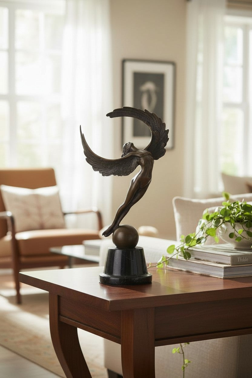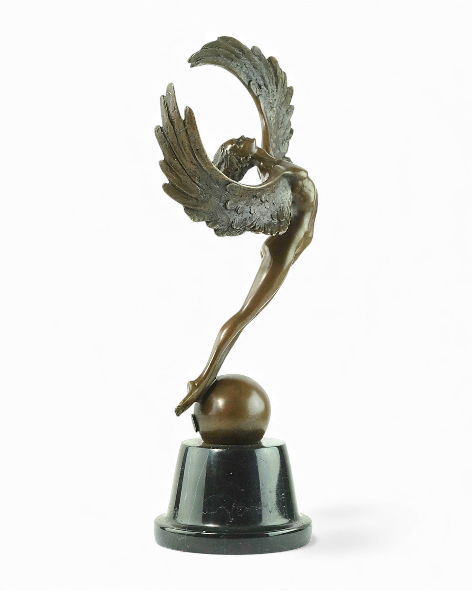 Bronzeskulptur einer geflügelten Frau in aufsteigender Bewegung