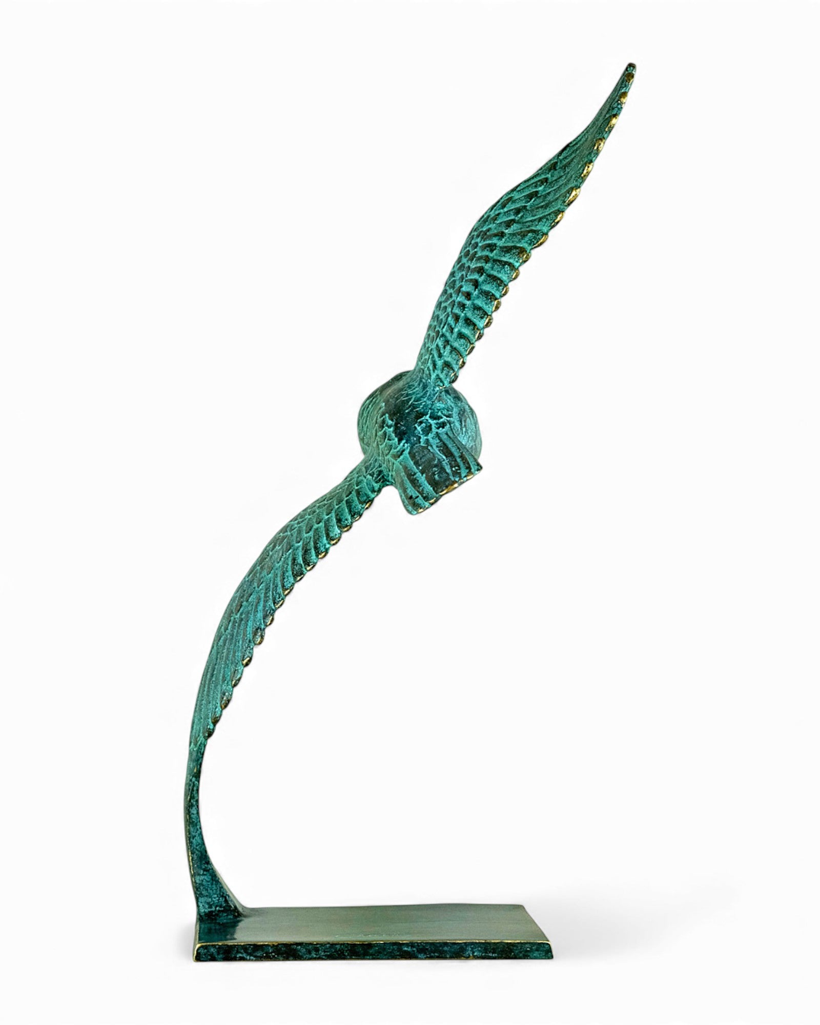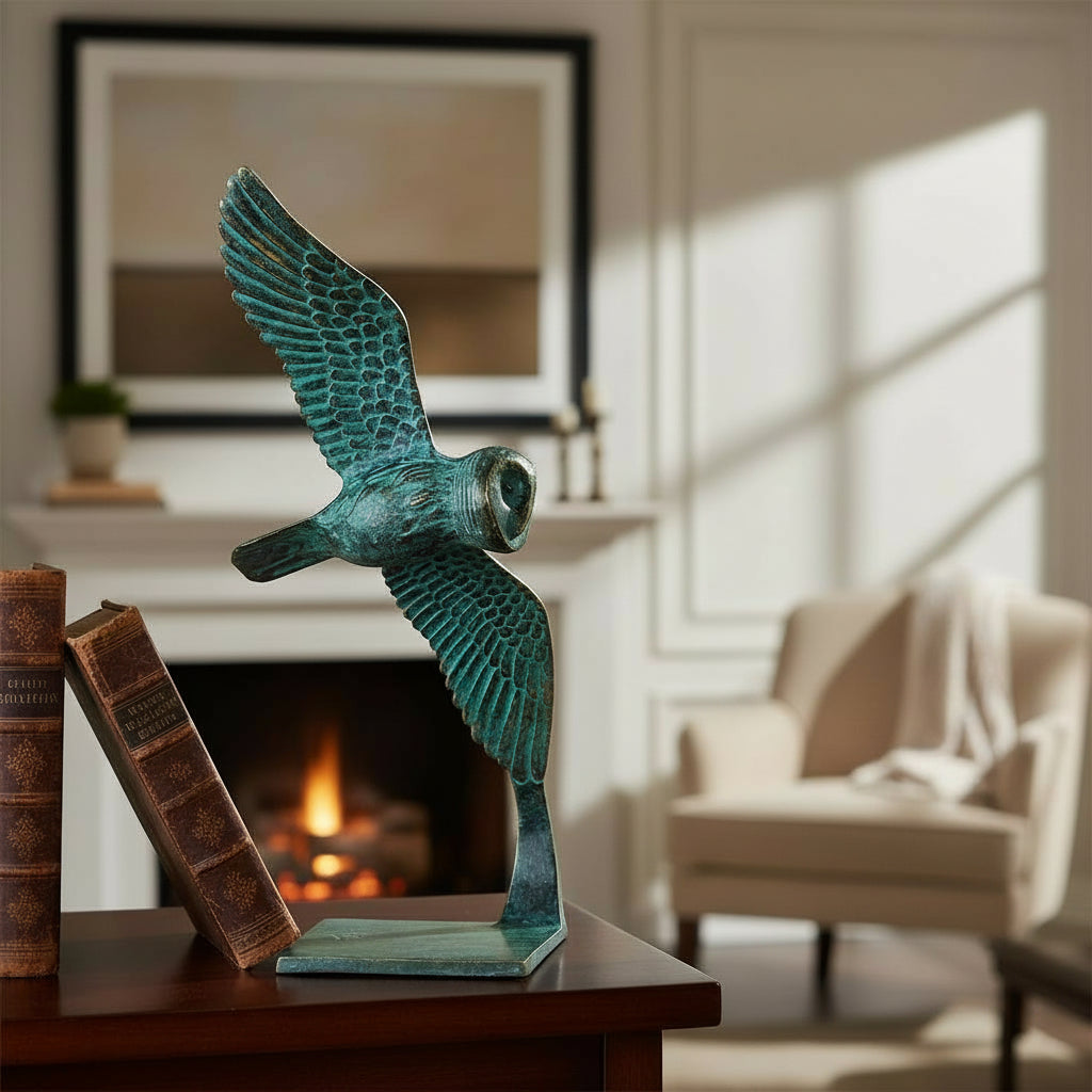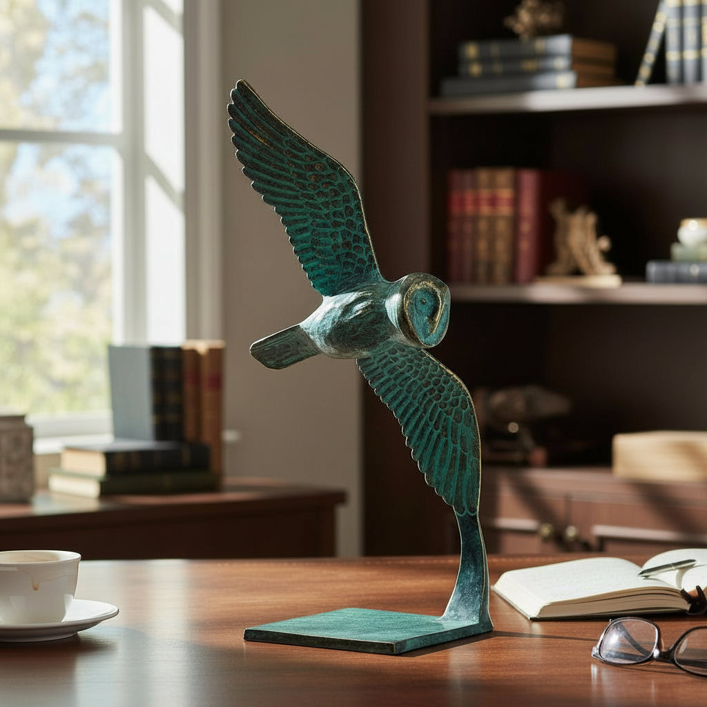 Bronzeskulptur einer Eule, die durch die Luft gleitet