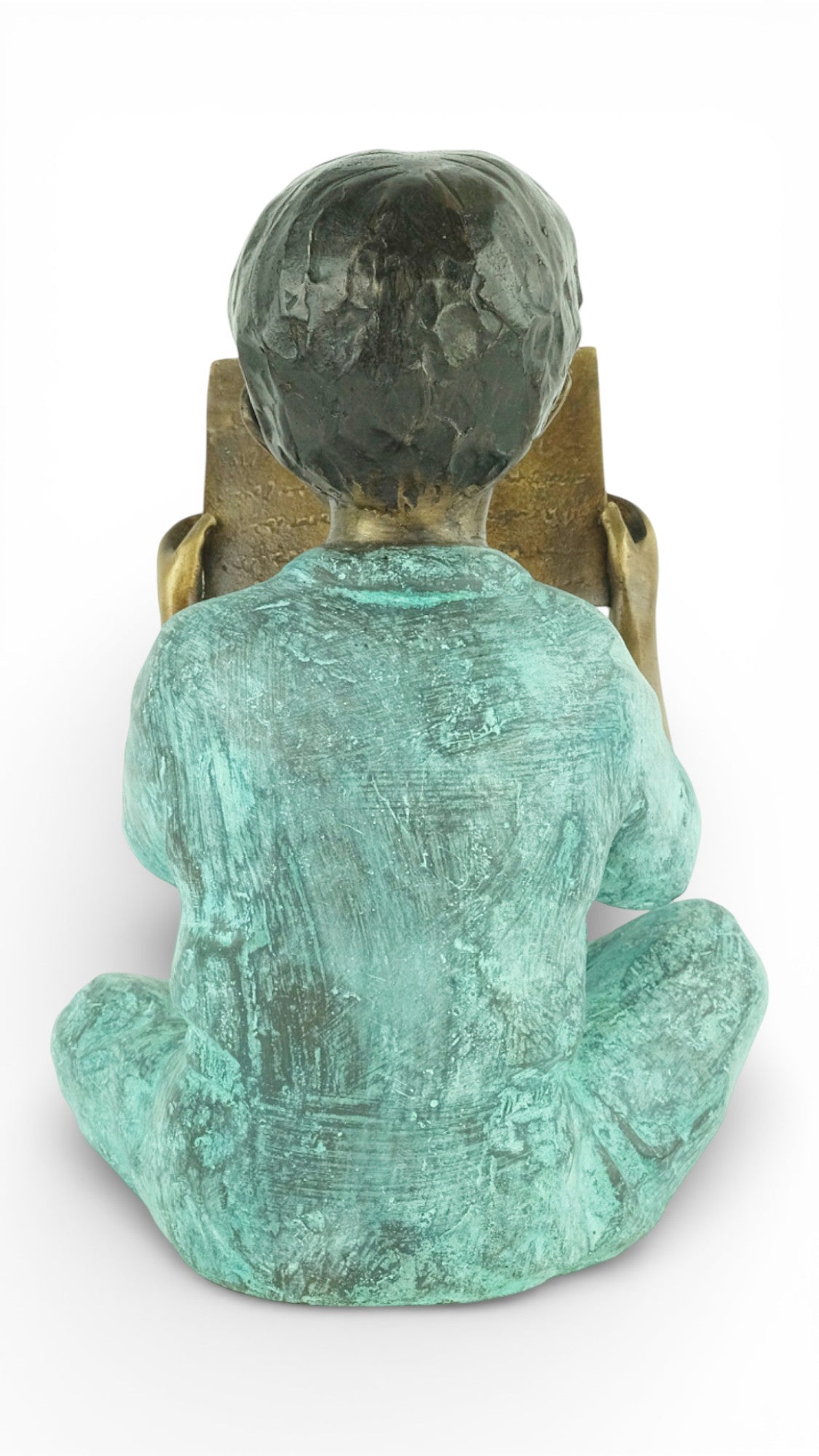 Preciosa escultura de bronce que representa a un joven leyendo un libro sentado.