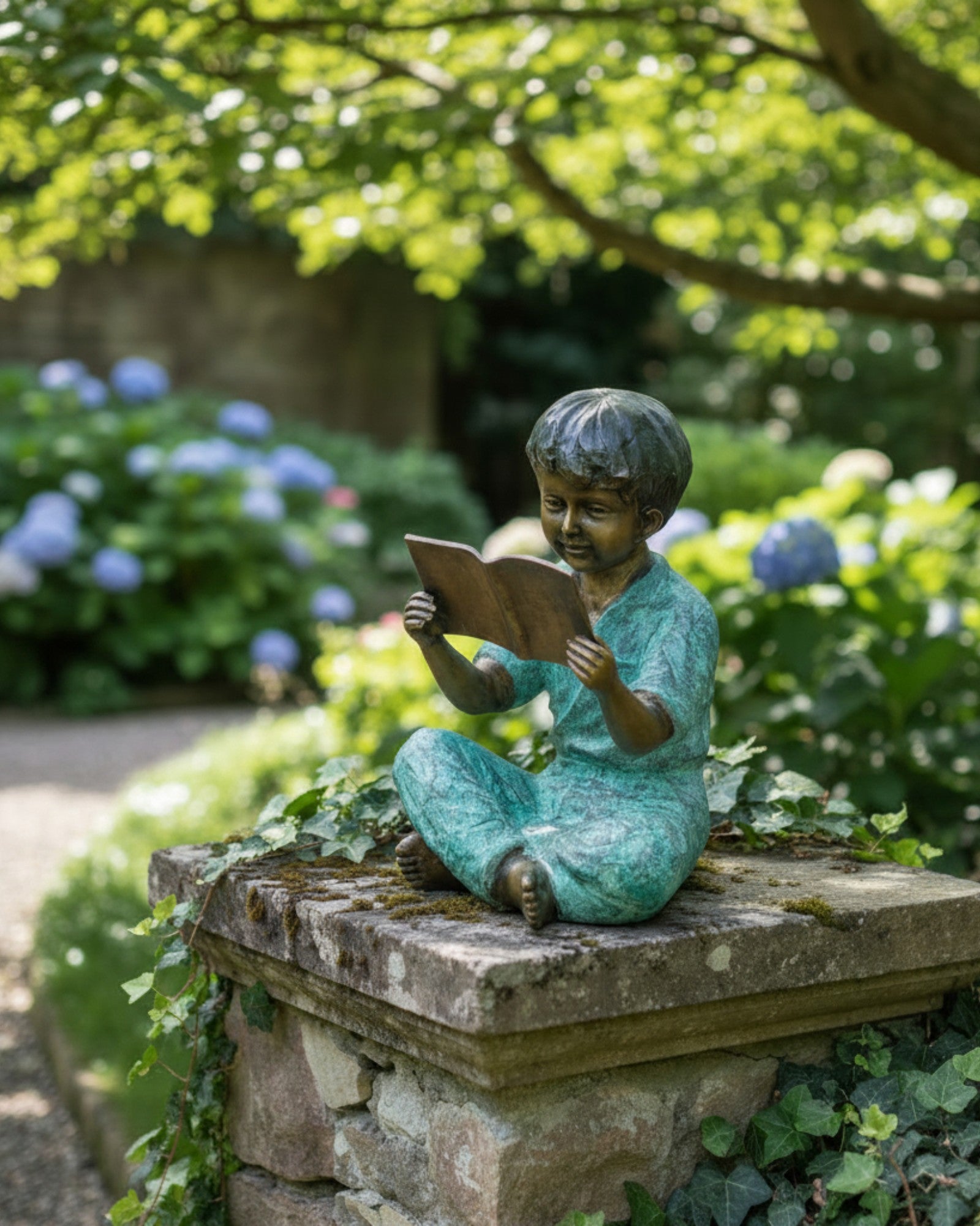 Escultura de bronce de un joven sentado leyendo un libro