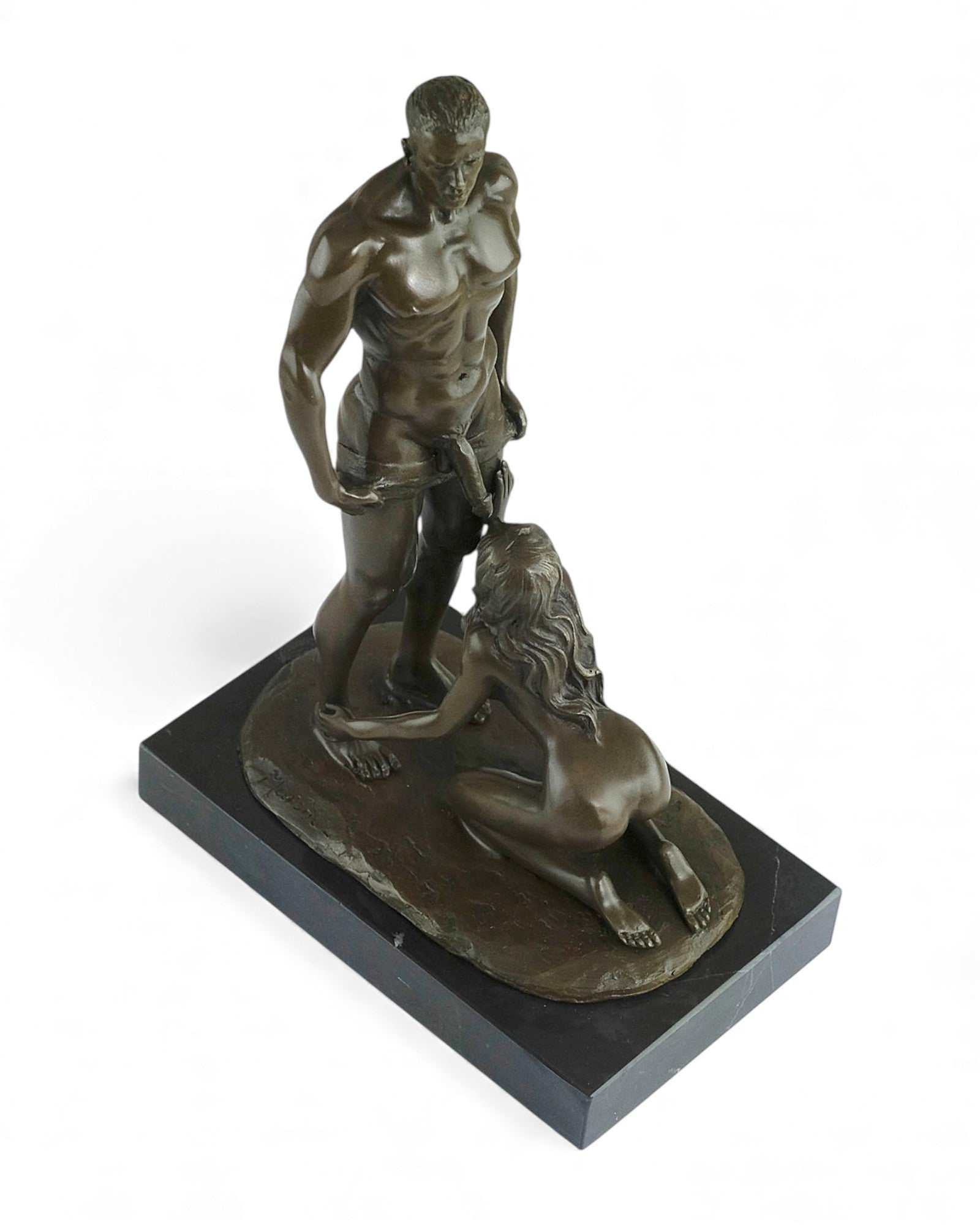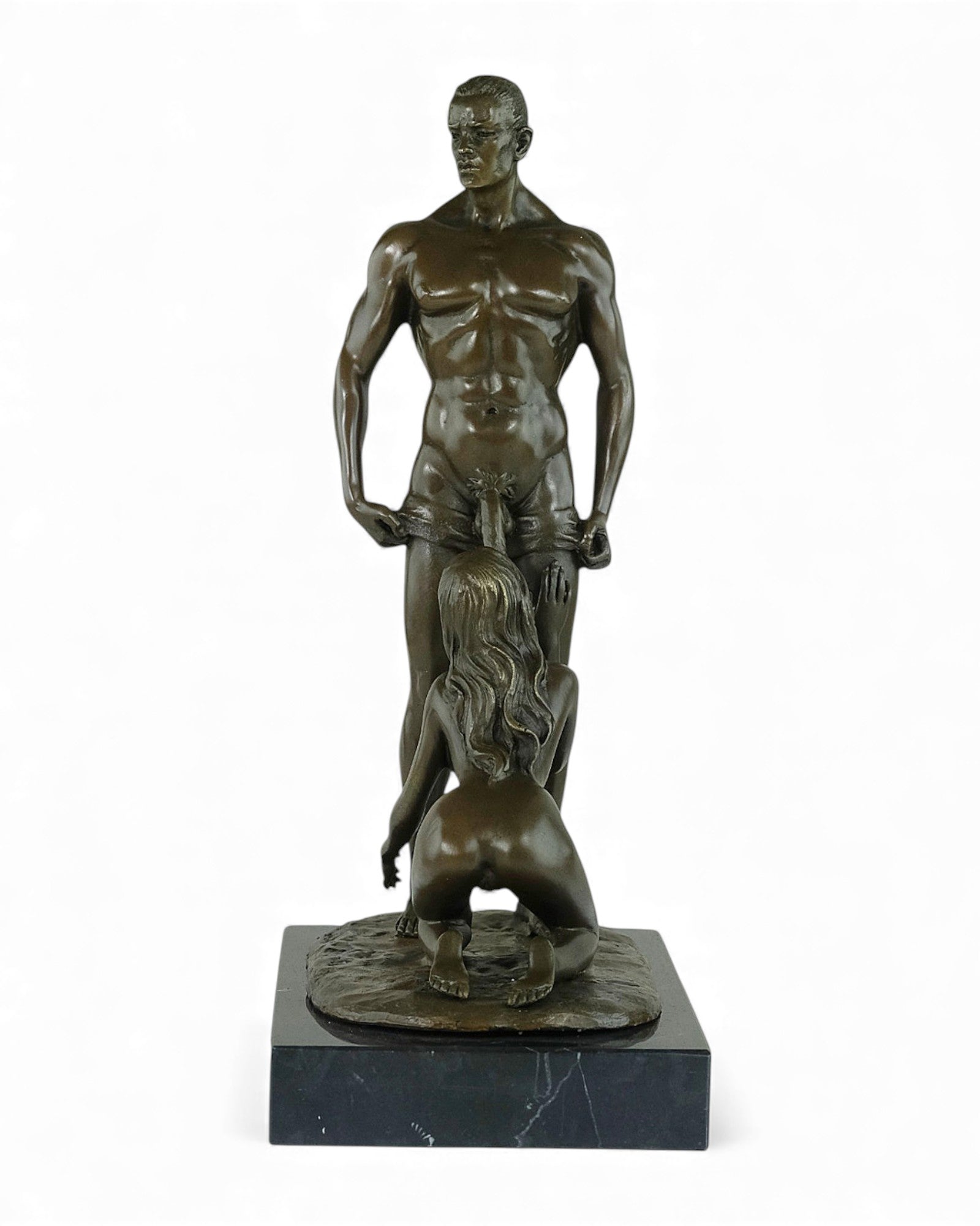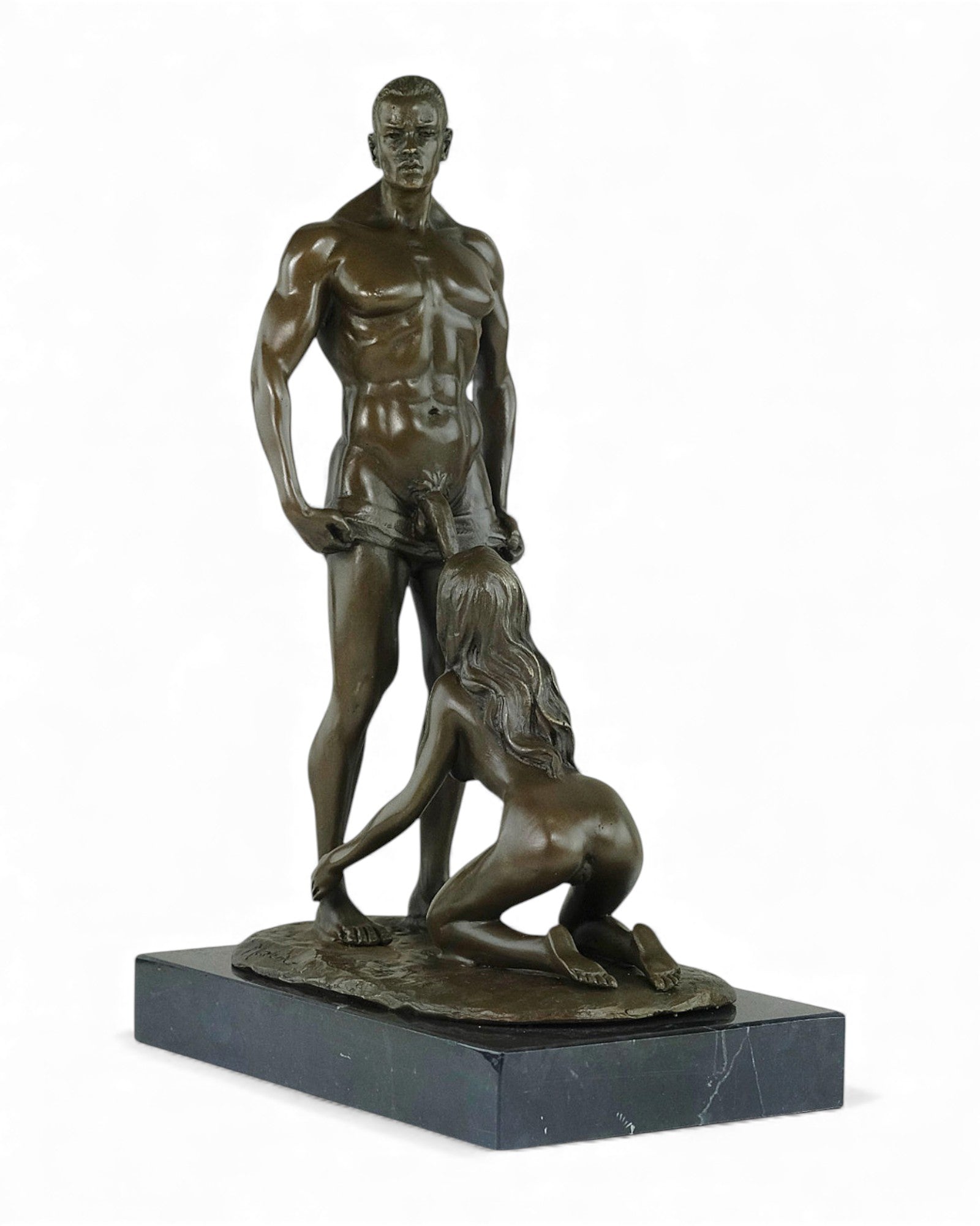 Escultura erótica de bronce de una mujer dando placer oral a un hombre