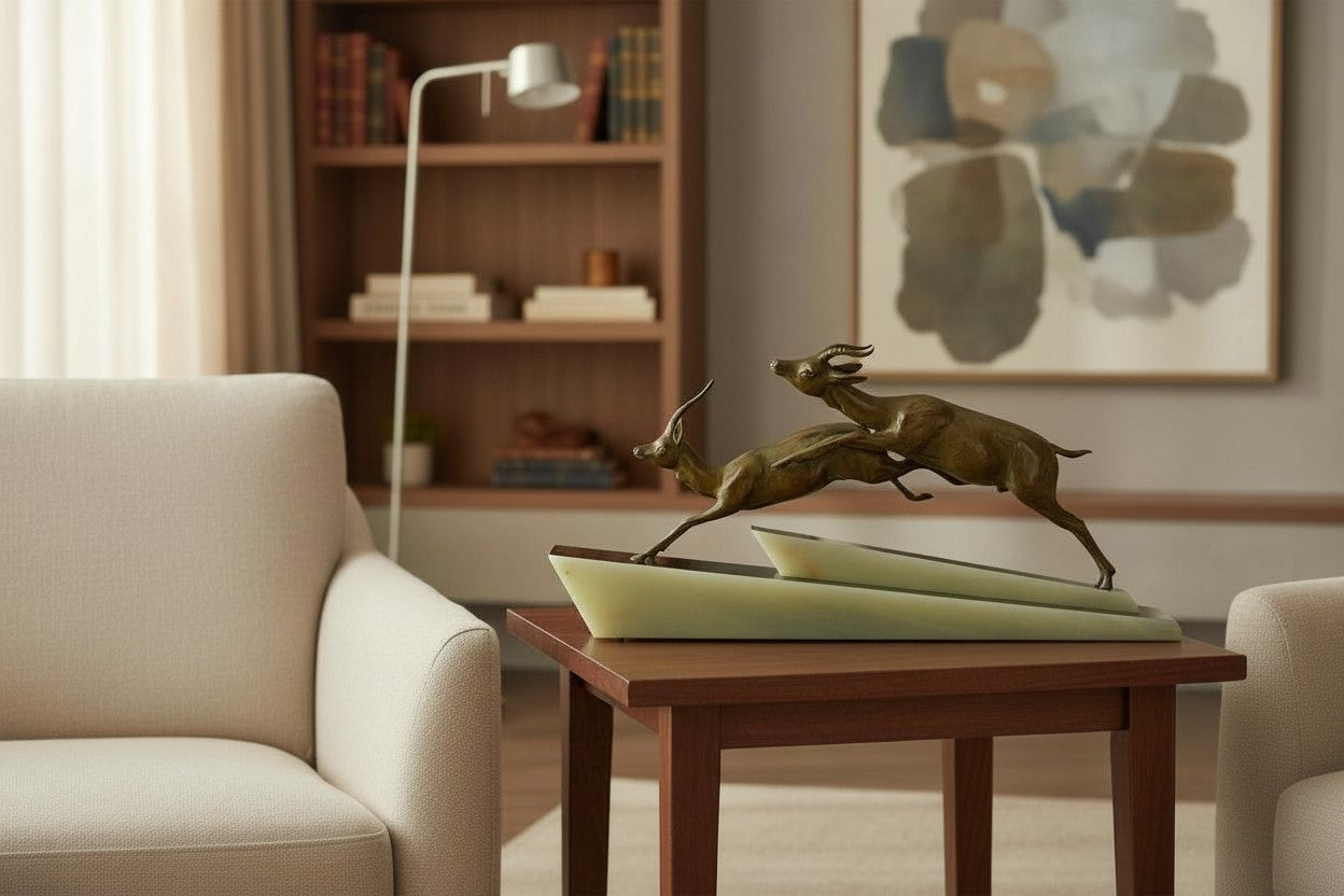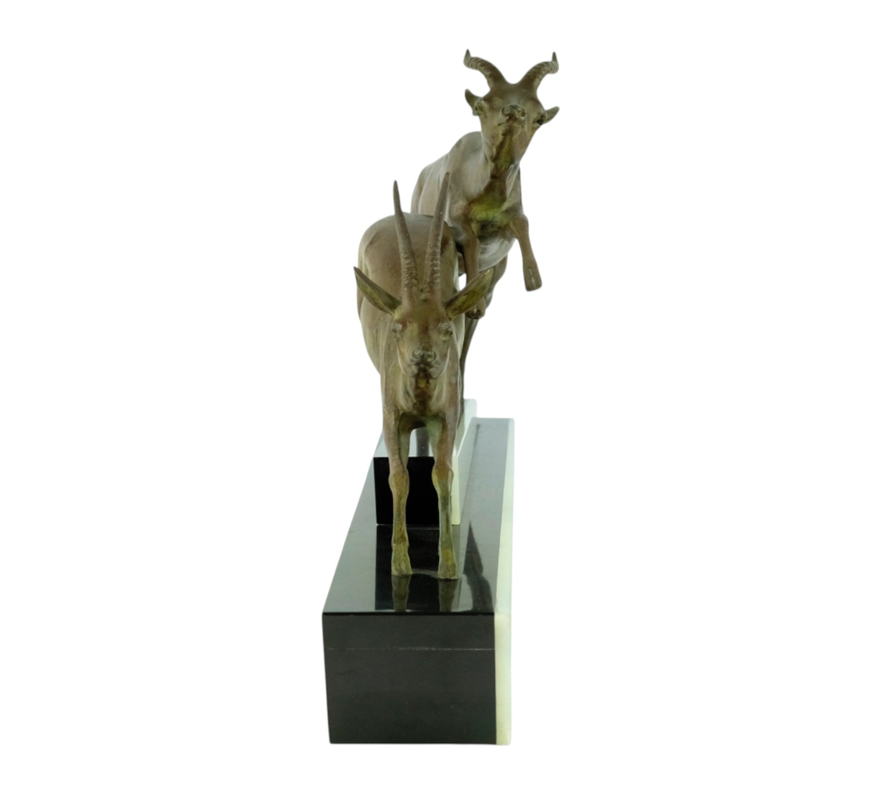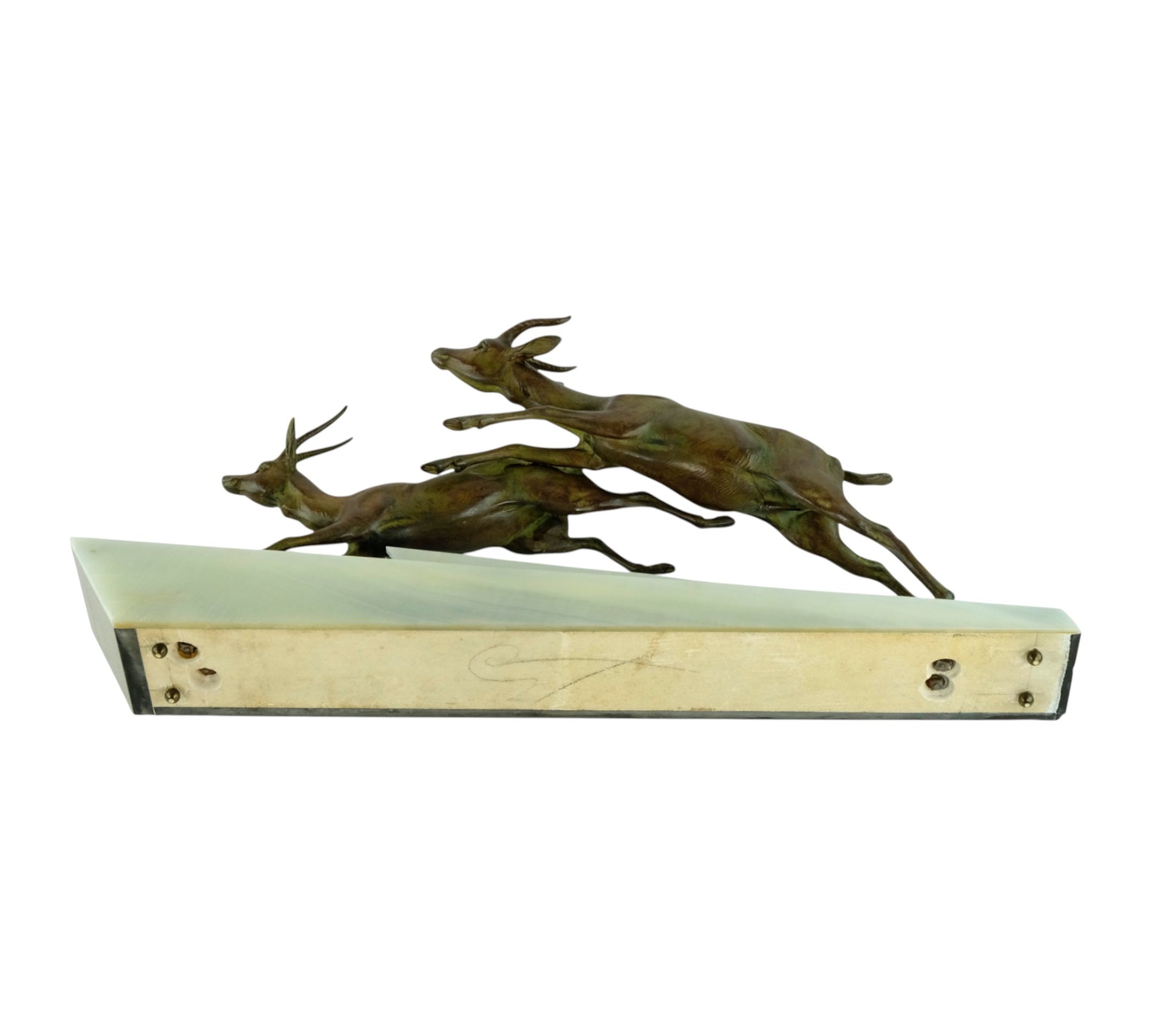 Dit prachtige antieke Art Deco sculptuur toont twee sierlijk springende gazellen voor, vastgelegd in volle vaart in hun elegante, langgerekte vormen.
