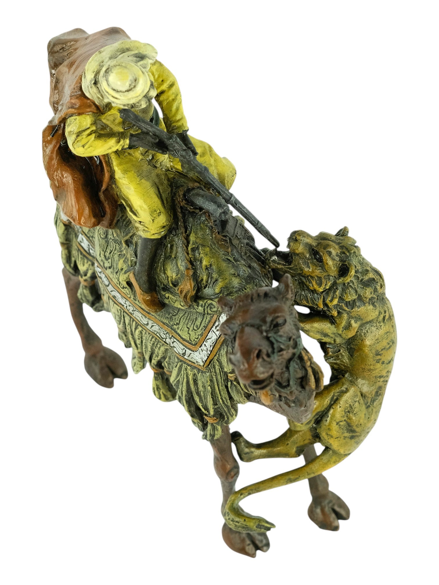 A lovely bronze figurine depicting a soldier on a camel, fighting off an attacking lion.